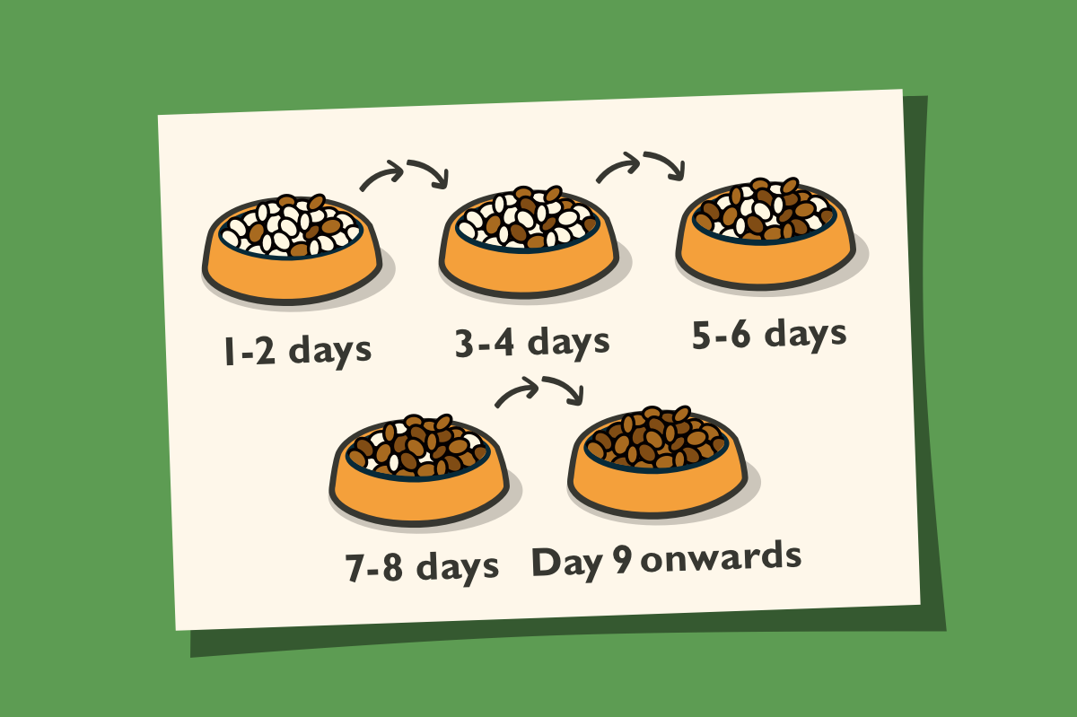 Make the switch gradually. Introduce the recipes into your buddy’s diet bit by bit over about a week. Start with a mix of 4/5 of your current food to 1/5 of the intended recipe.